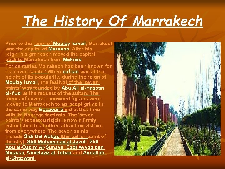 The History Of Marrakech Prior to the reign of Moulay Ismail, Marrakech was the capital of Morocco. After his reign, his grandson moved the capital back to Marrakech from Meknès. For centuries Marrakech has been known for its 'seven saints. ' When sufism was at the height of its popularity, during the reign of Moulay Ismail, the festival of the 'seven saints' was founded by Abu Ali al-Hassan al-Yusi at the request of the sultan. The tombs of several renowned figures were moved to Marrakech to attract pilgrims in the same way Essaouira did at that time with its Regrega festivals. The 'seven saints' (sebaatou rizjel) is now a firmly established institution, attracting visitors from everywhere. The seven saints include Sidi Bel Abbas (the patron saint of the city), Sidi Muhammad al-Jazuli, Sidi Abu al-Qasim Al-Suhayli, Cadi Ayyad ben Moussa, Abdelaziz al-Tebaa and Abdallah al-Ghazwani.