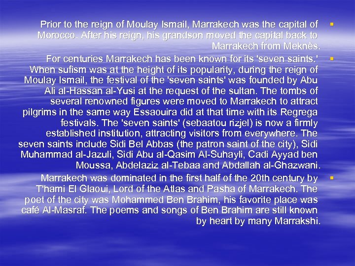 Prior to the reign of Moulay Ismail, Marrakech was the capital of § Morocco. After his reign, his grandson moved the capital back to Marrakech from Meknès. For centuries Marrakech has been known for its 'seven saints. ' § When sufism was at the height of its popularity, during the reign of Moulay Ismail, the festival of the 'seven saints' was founded by Abu Ali al-Hassan al-Yusi at the request of the sultan. The tombs of several renowned figures were moved to Marrakech to attract pilgrims in the same way Essaouira did at that time with its Regrega festivals. The 'seven saints' (sebaatou rizjel) is now a firmly established institution, attracting visitors from everywhere. The seven saints include Sidi Bel Abbas (the patron saint of the city), Sidi Muhammad al-Jazuli, Sidi Abu al-Qasim Al-Suhayli, Cadi Ayyad ben Moussa, Abdelaziz al-Tebaa and Abdallah al-Ghazwani. Marrakech was dominated in the first half of the 20 th century by § T'hami El Glaoui, Lord of the Atlas and Pasha of Marrakech. The poet of the city was Mohammed Ben Brahim, his favorite place was café Al-Masraf. The poems and songs of Ben Brahim are still known by heart by many Marrakshi.