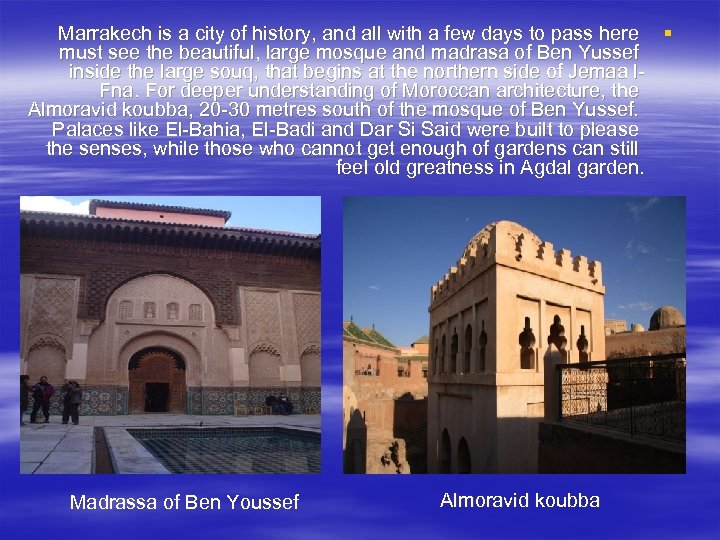 Marrakech is a city of history, and all with a few days to pass here § must see the beautiful, large mosque and madrasa of Ben Yussef inside the large souq, that begins at the northern side of Jemaa l. Fna. For deeper understanding of Moroccan architecture, the Almoravid koubba, 20 -30 metres south of the mosque of Ben Yussef. Palaces like El-Bahia, El-Badi and Dar Si Said were built to please the senses, while those who cannot get enough of gardens can still feel old greatness in Agdal garden. Madrassa of Ben Youssef Almoravid koubba