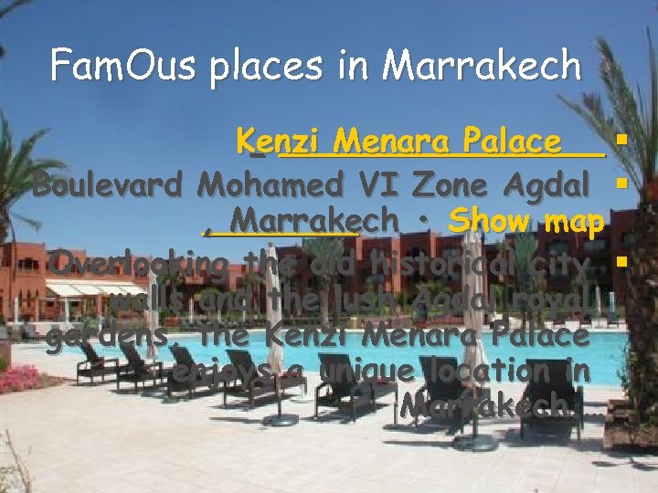 Fam. Ous places in Marrakech Kenzi Menara Palace § Boulevard Mohamed VI Zone Agdal § , Marrakech • Show map Overlooking the old historical city § walls and the lush Agdal royal gardens, the Kenzi Menara Palace enjoys a unique location in Marrakech. …
