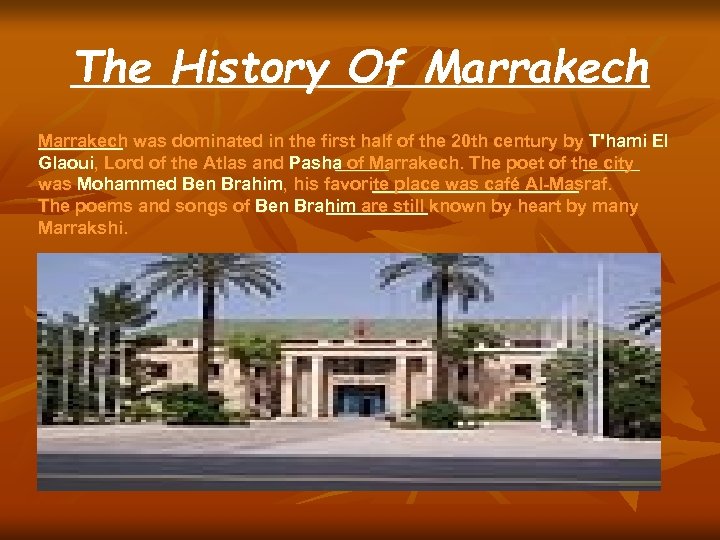 The History Of Marrakech was dominated in the first half of the 20 th century by T'hami El Glaoui, Lord of the Atlas and Pasha of Marrakech. The poet of the city was Mohammed Ben Brahim, his favorite place was café Al-Masraf. The poems and songs of Ben Brahim are still known by heart by many Marrakshi.
