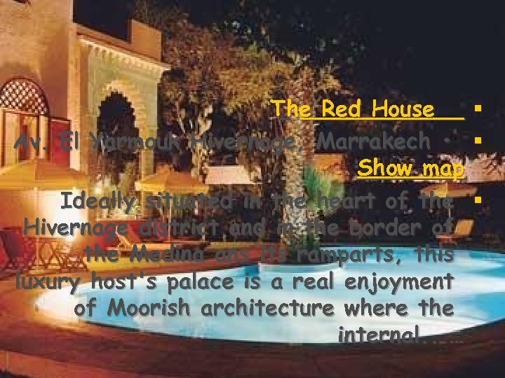 The Red House § Av. El Yarmouk Hivernage, Marrakech • § Show map Ideally situated in the heart of the § Hivernage district and in the border of the Medina ans its ramparts, this luxury host's palace is a real enjoyment of Moorish architecture where the internal. . . …