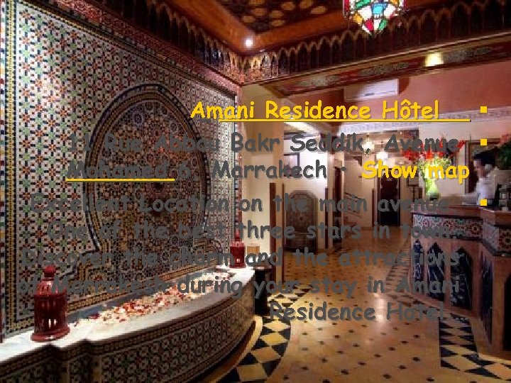 Amani Residence Hôtel § 11 Rue Abbou Bakr Seddik, Avenue § Mohamed 6, Marrakech • Show map Excellent Location on the main avenue. § One of the best three stars in town. Discover the charm and the attractions of Marrakesh during your stay in Amani Residence Hotel. …