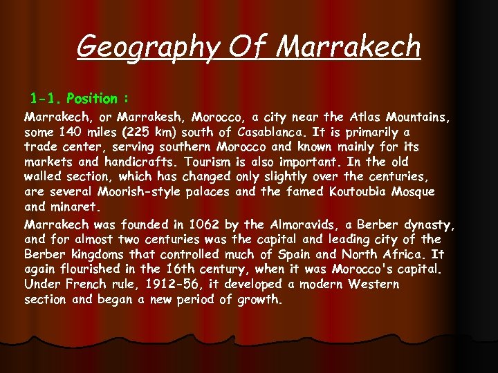 Geography Of Marrakech 1 -1. Position : Marrakech, or Marrakesh, Morocco, a city near the Atlas Mountains, some 140 miles (225 km) south of Casablanca. It is primarily a trade center, serving southern Morocco and known mainly for its markets and handicrafts. Tourism is also important. In the old walled section, which has changed only slightly over the centuries, are several Moorish-style palaces and the famed Koutoubia Mosque and minaret. Marrakech was founded in 1062 by the Almoravids, a Berber dynasty, and for almost two centuries was the capital and leading city of the Berber kingdoms that controlled much of Spain and North Africa. It again flourished in the 16 th century, when it was Morocco's capital. Under French rule, 1912 -56, it developed a modern Western section and began a new period of growth.