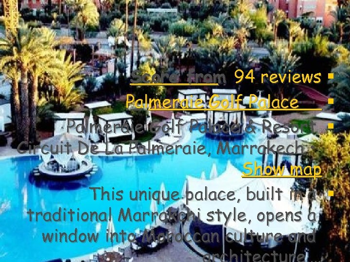 Score from 94 reviews § Palmeraie Golf Palace & Resort § Circuit De La Palmeraie, Marrakech • Show map This unique palace, built in a § traditional Marrakchi style, opens a window into Moroccan culture and