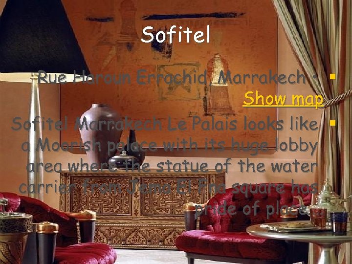 Sofitel Rue Haroun Errachid, Marrakech • § Show map Sofitel Marrakech Le Palais looks like § a Moorish palace with its huge lobby area where the statue of the water carrier from Jema El Fna square has pride of place. …