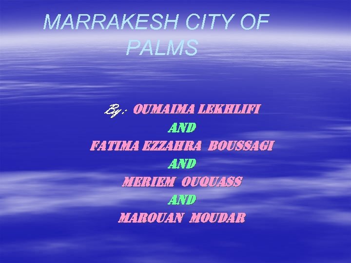 MARRAKESH CITY OF PALMS By : oumaima Le. KHLi. Fi and Fa. Tima e. ZZa. Hra Boussa. Gi and meriem ouquass and marouan moudar