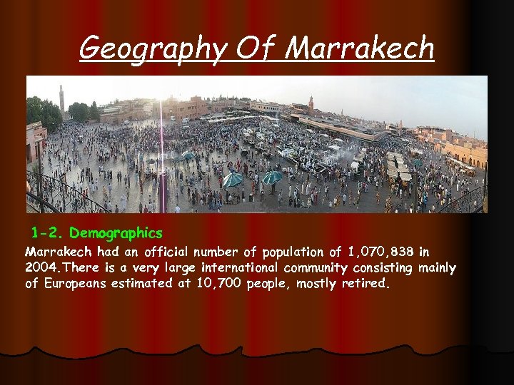Geography Of Marrakech 1 -2. Demographics Marrakech had an official number of population of 1, 070, 838 in 2004. There is a very large international community consisting mainly of Europeans estimated at 10, 700 people, mostly retired.
