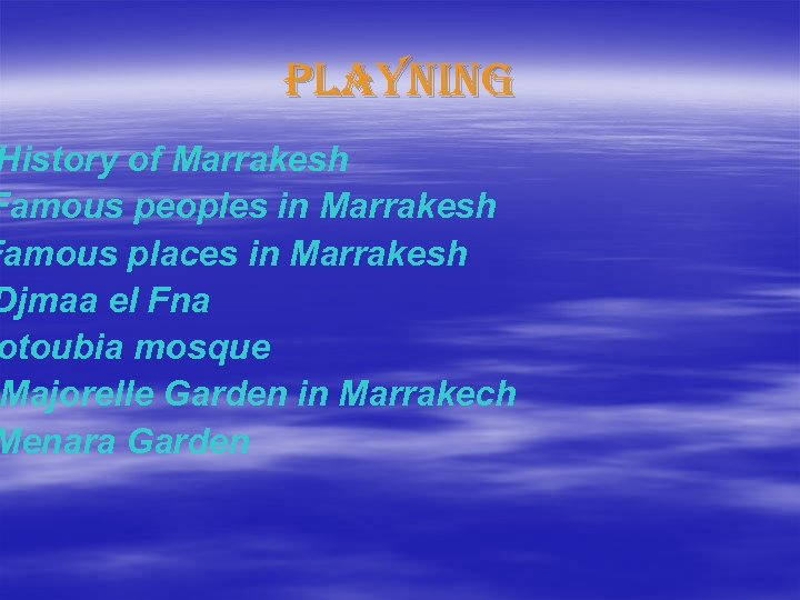 playnin. G History of Marrakesh Famous peoples in Marrakesh Famous places in Marrakesh Djmaa el Fna otoubia mosque Majorelle Garden in Marrakech Menara Garden