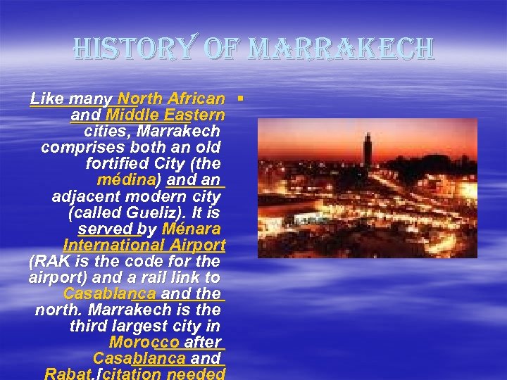 history of marrakech Like many North African § and Middle Eastern cities, Marrakech comprises both an old fortified City (the médina) and an adjacent modern city (called Gueliz). It is served by Ménara International Airport (RAK is the code for the airport) and a rail link to Casablanca and the north. Marrakech is the third largest city in Morocco after Casablanca and Rabat. [citation needed