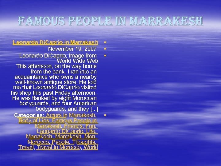 famous people in marrakesh Leonardo Di. Caprio in Marrakesh November 19, 2007 Leonardo Di. Caprio, Image from World Wide Web This afternoon, on the way home from the bank, I ran into an acquaintance who owns a nearby well-known antique store. He told me that Leonardo Di. Caprio visited his shop this past Friday afternoon. He was flanked by eight Moroccan bodyguards, and four American bodyguards, and they [. . . ] Categories: Actors in Marrakesh, Body of Lies, Famous People in Marrakesh, Friends, Fun, Leonardo Di. Caprio, Life, Marrakech, Marrakesh, Men, Morocco, People, Thoughts, Travel in Morocco, World § §