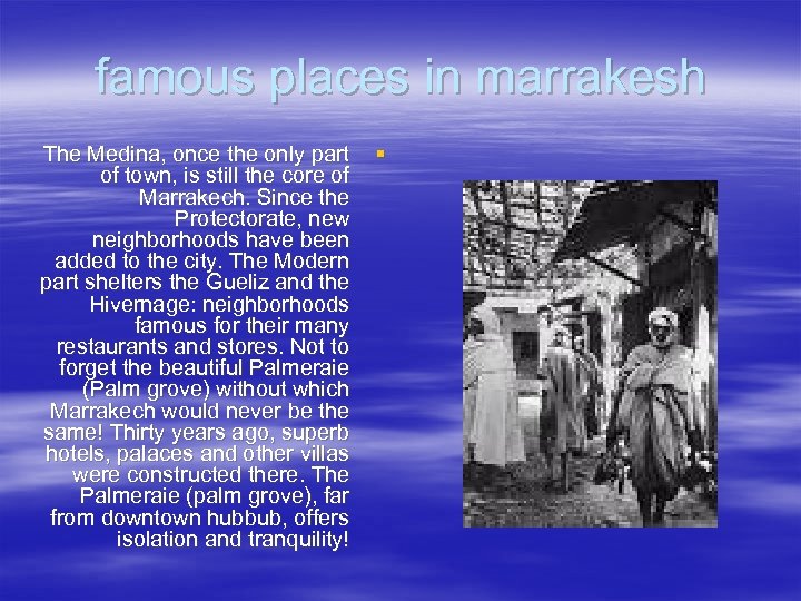 famous places in marrakesh The Medina, once the only part of town, is still the core of Marrakech. Since the Protectorate, new neighborhoods have been added to the city. The Modern part shelters the Gueliz and the Hivernage: neighborhoods famous for their many restaurants and stores. Not to forget the beautiful Palmeraie (Palm grove) without which Marrakech would never be the same! Thirty years ago, superb hotels, palaces and other villas were constructed there. The Palmeraie (palm grove), far from downtown hubbub, offers isolation and tranquility! §