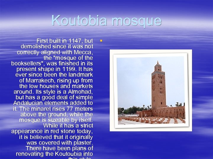 Koutobia mosque First built in 1147, but demolished since it was not correctly aligned with Mecca, the "mosque of the booksellers", was finished in its present shape in 1199. It has ever since been the landmark of Marrakech, rising up from the low houses and markets around. Its style is a Almohad, but has a good deal of simple Andalucian elements added to it. The minaret rises 77 meters above the ground, while the mosque is sizeable by itself. While it has a strict appearance in red stone today, it is believed that it originally was covered with plaster. There have been plans of renovating the Koutoubia into §