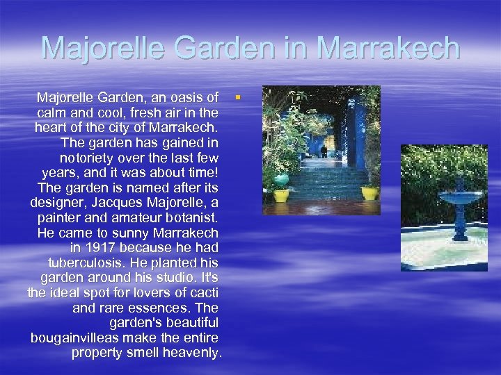 Majorelle Garden in Marrakech Majorelle Garden, an oasis of § calm and cool, fresh air in the heart of the city of Marrakech. The garden has gained in notoriety over the last few years, and it was about time! The garden is named after its designer, Jacques Majorelle, a painter and amateur botanist. He came to sunny Marrakech in 1917 because he had tuberculosis. He planted his garden around his studio. It's the ideal spot for lovers of cacti and rare essences. The garden's beautiful bougainvilleas make the entire property smell heavenly.