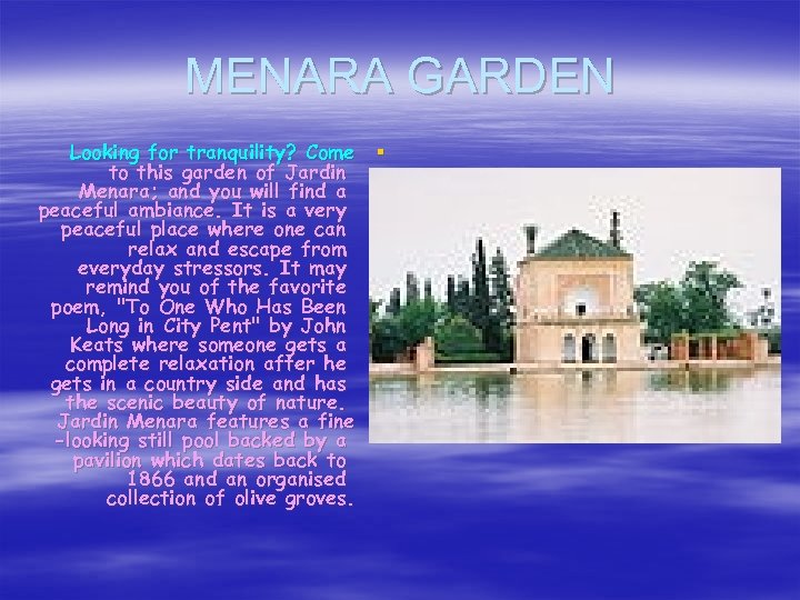 MENARA GARDEN Looking for tranquility? Come § to this garden of Jardin Menara; and you will find a peaceful ambiance. It is a very peaceful place where one can relax and escape from everyday stressors. It may remind you of the favorite poem, "To One Who Has Been Long in City Pent" by John Keats where someone gets a complete relaxation after he gets in a country side and has the scenic beauty of nature. Jardin Menara features a fine -looking still pool backed by a pavilion which dates back to 1866 and an organised collection of olive groves.