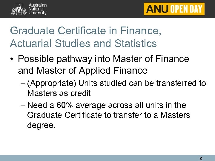 Graduate Certificate in Finance, Actuarial Studies and Statistics • Possible pathway into Master of Finance and Master of Applied Finance – (Appropriate) Units studied can be transferred to Masters as credit – Need a 60% average across all units in the Graduate Certificate to transfer to a Masters degree. 8