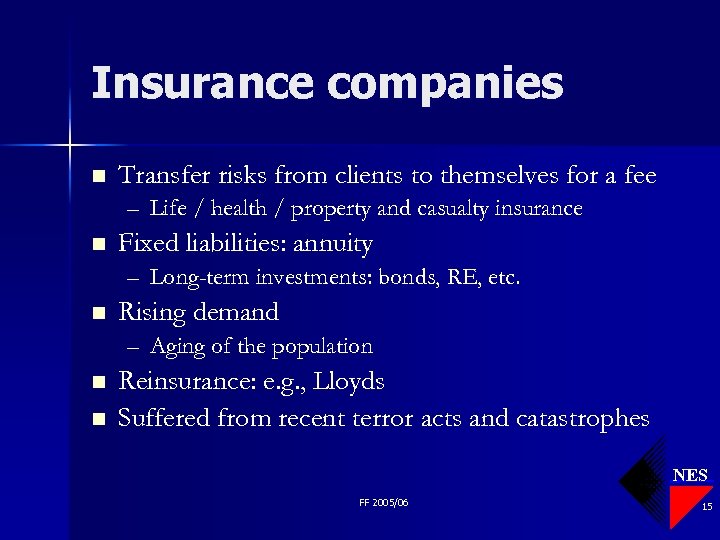 Insurance companies n Transfer risks from clients to themselves for a fee – Life / health / property and casualty insurance n Fixed liabilities: annuity – Long-term investments: bonds, RE, etc. n Rising demand – Aging of the population n n Reinsurance: e. g. , Lloyds Suffered from recent terror acts and catastrophes NES FF 2005/06 15
