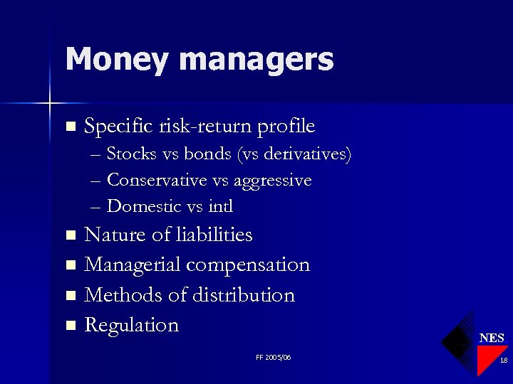 Money managers n Specific risk-return profile – Stocks vs bonds (vs derivatives) – Conservative vs aggressive – Domestic vs intl Nature of liabilities n Managerial compensation n Methods of distribution n Regulation n FF 2005/06 NES 18