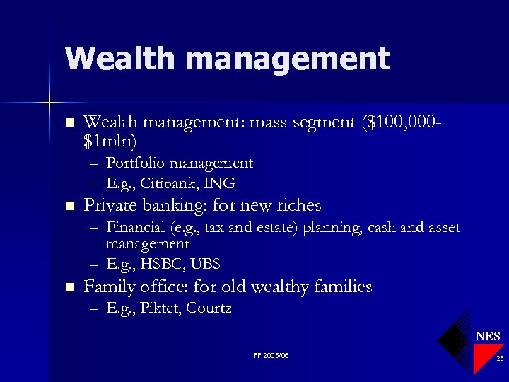 Wealth management n Wealth management: mass segment ($100, 000$1 mln) – Portfolio management – E. g. , Citibank, ING n Private banking: for new riches – Financial (e. g. , tax and estate) planning, cash and asset management – E. g. , HSBC, UBS n Family office: for old wealthy families – E. g. , Piktet, Courtz NES FF 2005/06 25