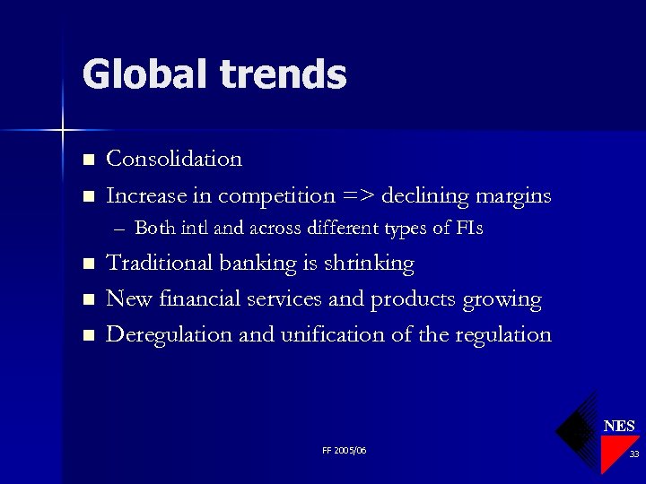 Global trends n n Consolidation Increase in competition => declining margins – Both intl and across different types of FIs n n n Traditional banking is shrinking New financial services and products growing Deregulation and unification of the regulation NES FF 2005/06 33