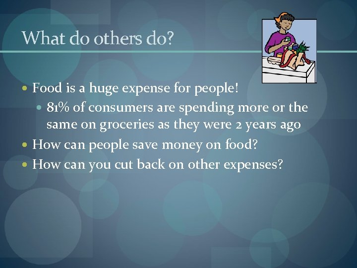 What do others do? Food is a huge expense for people! 81% of consumers are spending more or the same on groceries as they were 2 years ago How can people save money on food? How can you cut back on other expenses?