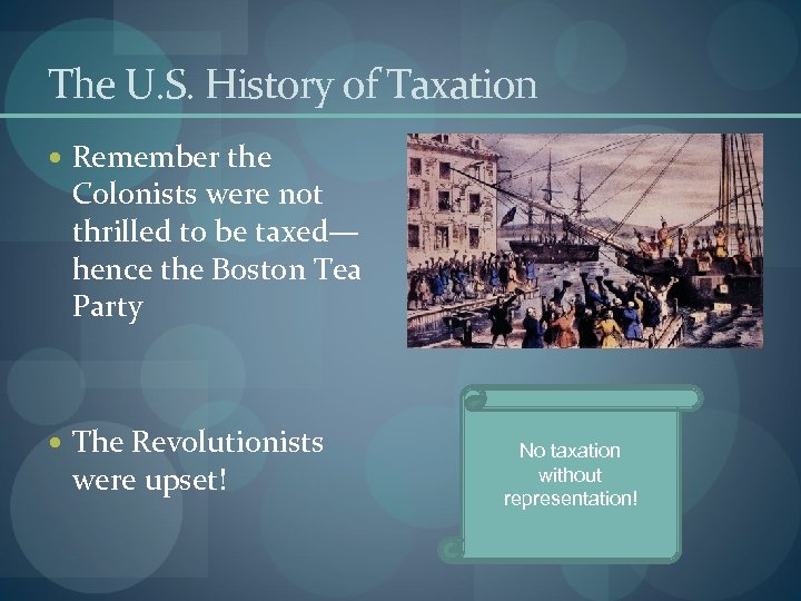 The U. S. History of Taxation Remember the Colonists were not thrilled to be taxed— hence the Boston Tea Party The Revolutionists were upset! No taxation without representation!