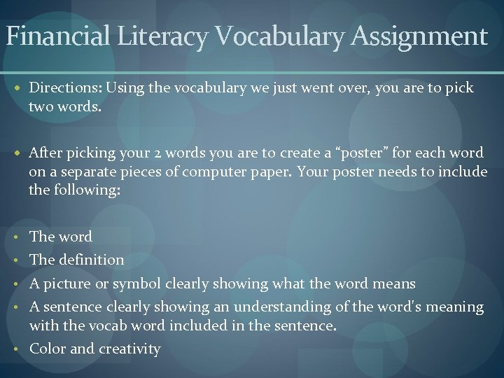 Financial Literacy Vocabulary Assignment Directions: Using the vocabulary we just went over, you are to pick two words. After picking your 2 words you are to create a “poster” for each word on a separate pieces of computer paper. Your poster needs to include the following: • The word • The definition • A picture or symbol clearly showing what the word means • A sentence clearly showing an understanding of the word's meaning with the vocab word included in the sentence. • Color and creativity