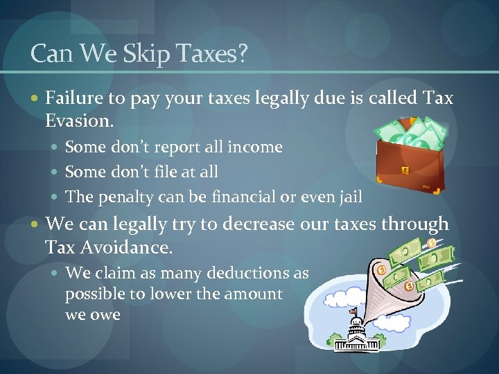 Can We Skip Taxes? Failure to pay your taxes legally due is called Tax Evasion. Some don’t report all income Some don’t file at all The penalty can be financial or even jail We can legally try to decrease our taxes through Tax Avoidance. We claim as many deductions as possible to lower the amount we owe