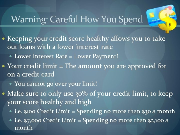 Warning: Careful How You Spend Keeping your credit score healthy allows you to take out loans with a lower interest rate Lower Interest Rate = Lower Payment! Your credit limit = The amount you are approved for on a credit card You cannot go over your limit! Make sure to only use 30% of your credit limit, to keep your score healthy and high i. e. $100 Credit Limit = Spending no more than $30 a month i. e. $7, 000 Credit Limit = Spending no more than $2, 100 a month