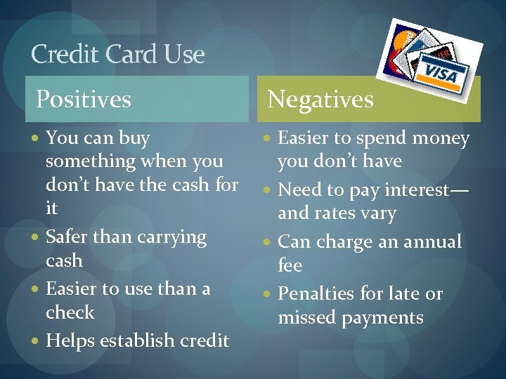 Credit Card Use Positives Negatives You can buy Easier to spend money something when you don’t have the cash for Need to pay interest— it and rates vary Safer than carrying Can charge an annual cash fee Easier to use than a Penalties for late or check missed payments Helps establish credit