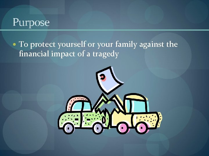 Purpose To protect yourself or your family against the financial impact of a tragedy