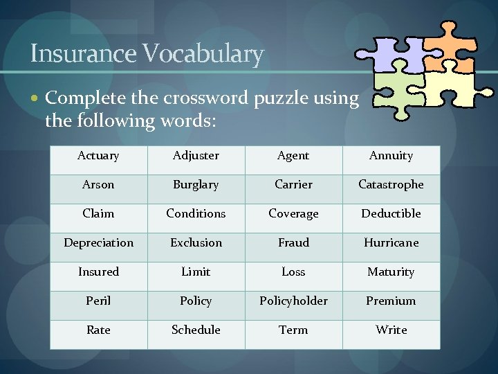 Insurance Vocabulary Complete the crossword puzzle using the following words: Actuary Adjuster Agent Annuity Arson Burglary Carrier Catastrophe Claim Conditions Coverage Deductible Depreciation Exclusion Fraud Hurricane Insured Limit Loss Maturity Peril Policyholder Premium Rate Schedule Term Write