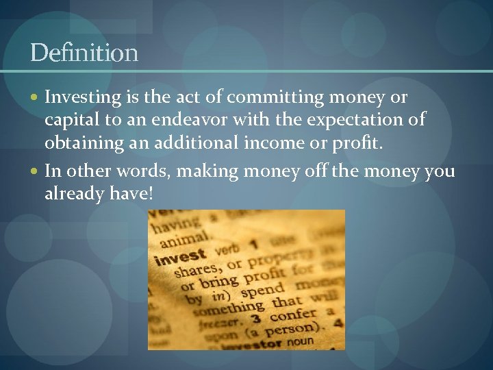Definition Investing is the act of committing money or capital to an endeavor with the expectation of obtaining an additional income or profit. In other words, making money off the money you already have!