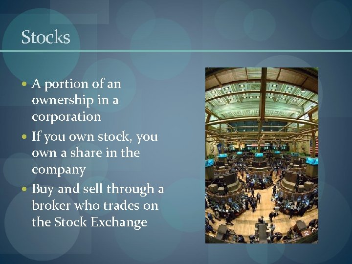 Stocks A portion of an ownership in a corporation If you own stock, you own a share in the company Buy and sell through a broker who trades on the Stock Exchange
