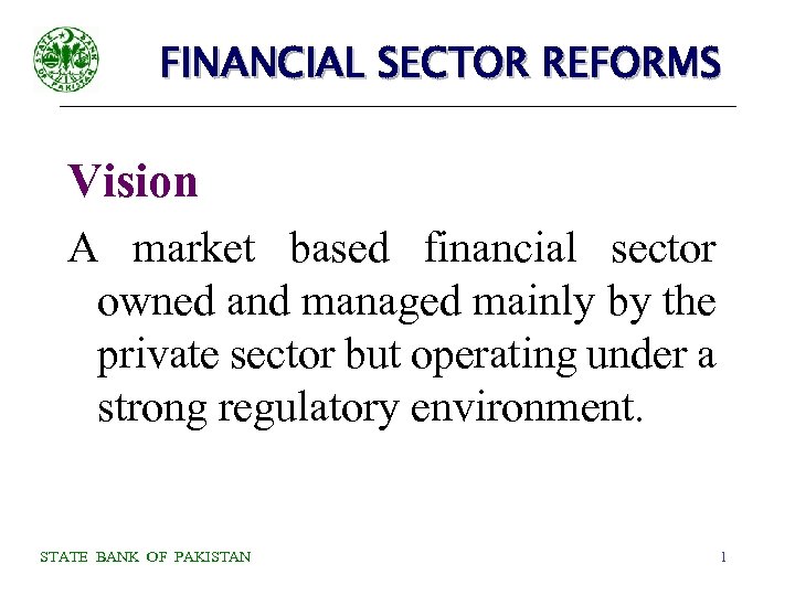 FINANCIAL SECTOR REFORMS Vision A market based financial sector owned and managed mainly by the private sector but operating under a strong regulatory environment. STATE BANK OF PAKISTAN 1