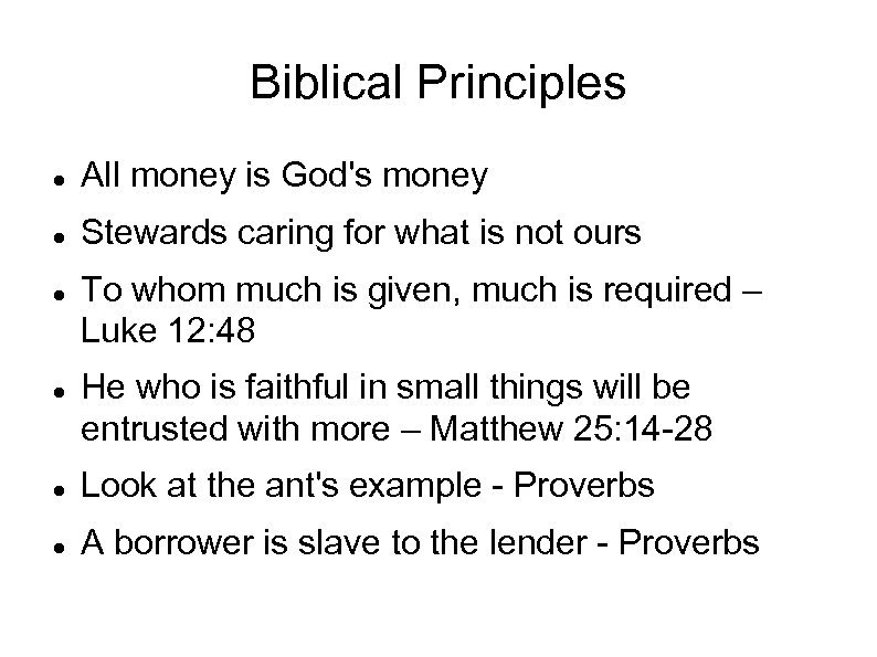 Biblical Principles All money is God's money Stewards caring for what is not ours To whom much is given, much is required – Luke 12: 48 He who is faithful in small things will be entrusted with more – Matthew 25: 14 -28 Look at the ant's example - Proverbs A borrower is slave to the lender - Proverbs
