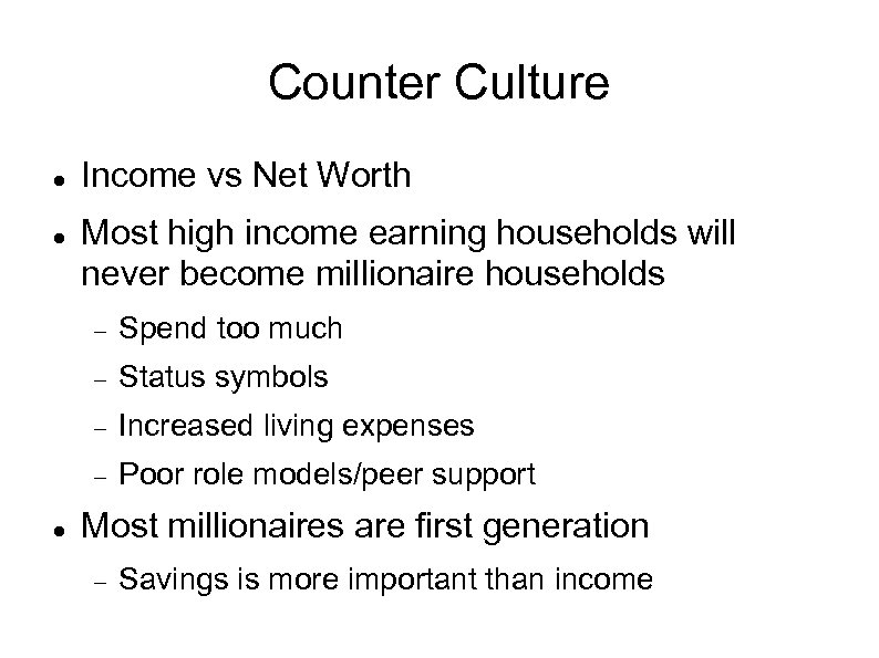 Counter Culture Income vs Net Worth Most high income earning households will never become millionaire households Status symbols Increased living expenses Spend too much Poor role models/peer support Most millionaires are first generation Savings is more important than income