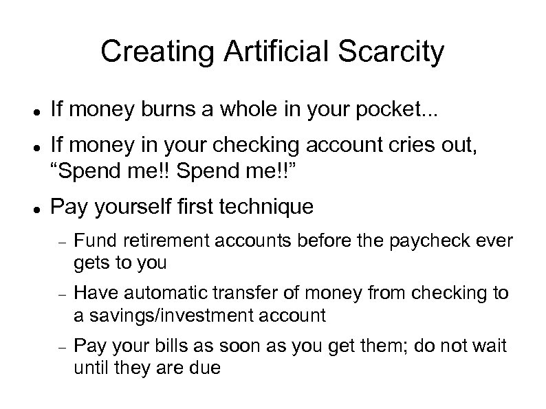 Creating Artificial Scarcity If money burns a whole in your pocket. . . If money in your checking account cries out, “Spend me!!” Pay yourself first technique Fund retirement accounts before the paycheck ever gets to you Have automatic transfer of money from checking to a savings/investment account Pay your bills as soon as you get them; do not wait until they are due
