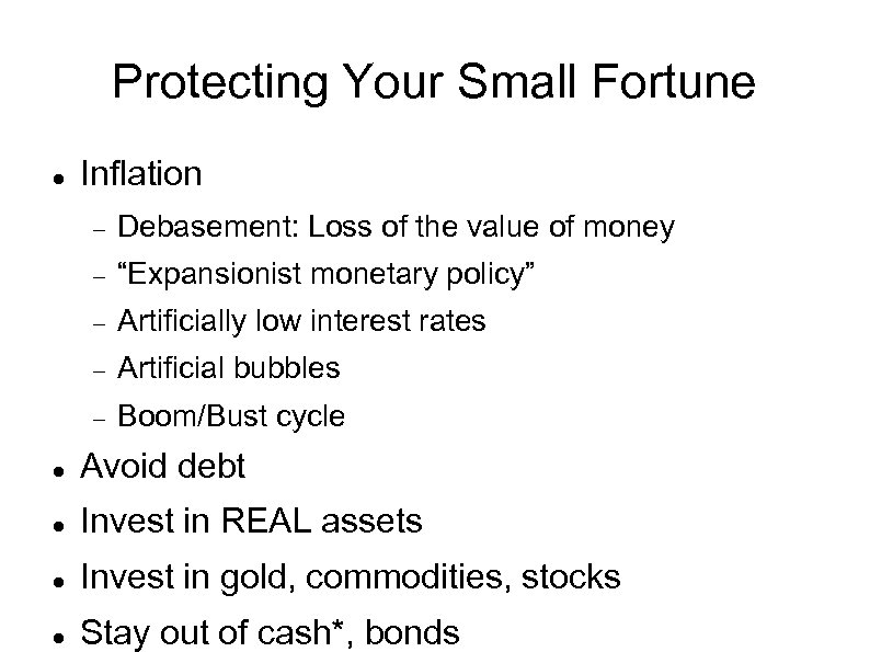 Protecting Your Small Fortune Inflation Debasement: Loss of the value of money “Expansionist monetary policy” Artificially low interest rates Artificial bubbles Boom/Bust cycle Avoid debt Invest in REAL assets Invest in gold, commodities, stocks Stay out of cash*, bonds