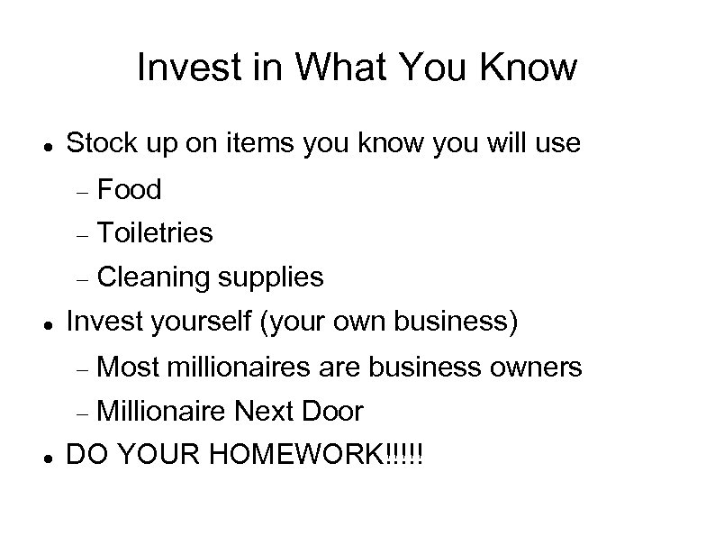 Invest in What You Know Stock up on items you know you will use Toiletries Food Cleaning supplies Invest yourself (your own business) Most millionaires are business owners Millionaire Next Door DO YOUR HOMEWORK!!!!!