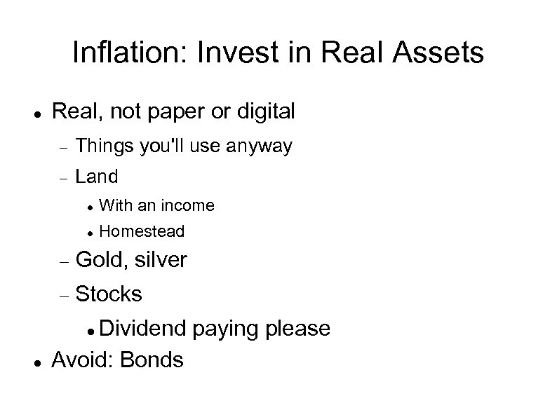 Inflation: Invest in Real Assets Real, not paper or digital Things you'll use anyway Land With an income Homestead Gold, silver Stocks Dividend paying please Avoid: Bonds