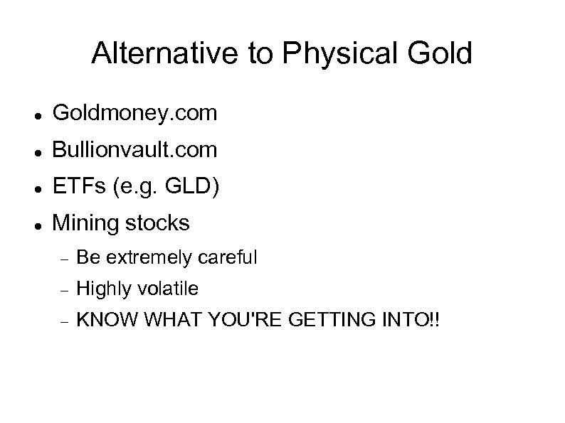 Alternative to Physical Goldmoney. com Bullionvault. com ETFs (e. g. GLD) Mining stocks Be extremely careful Highly volatile KNOW WHAT YOU'RE GETTING INTO!!