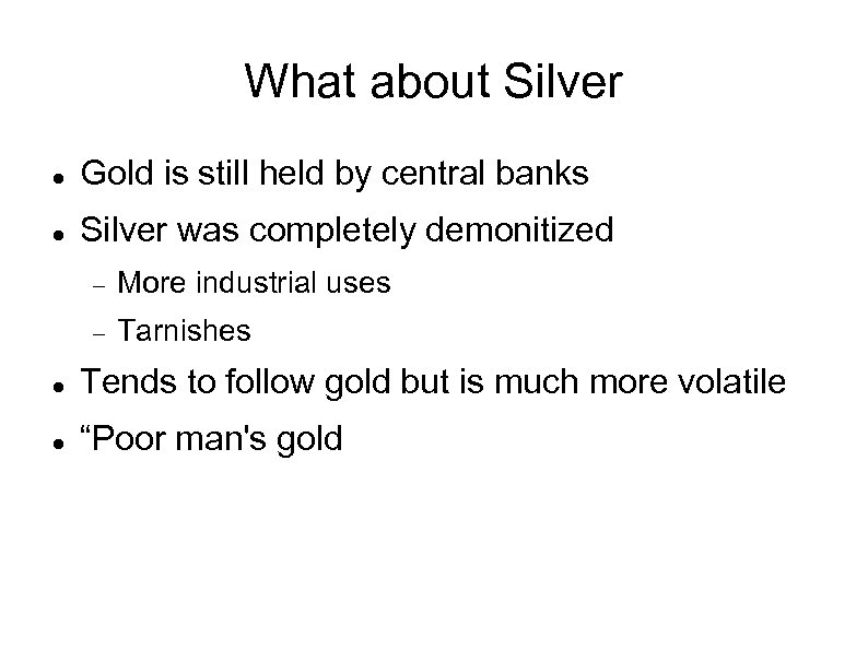 What about Silver Gold is still held by central banks Silver was completely demonitized More industrial uses Tarnishes Tends to follow gold but is much more volatile “Poor man's gold
