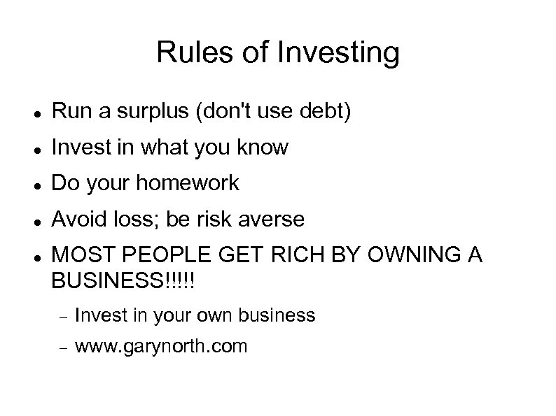 Rules of Investing Run a surplus (don't use debt) Invest in what you know Do your homework Avoid loss; be risk averse MOST PEOPLE GET RICH BY OWNING A BUSINESS!!!!! Invest in your own business www. garynorth. com