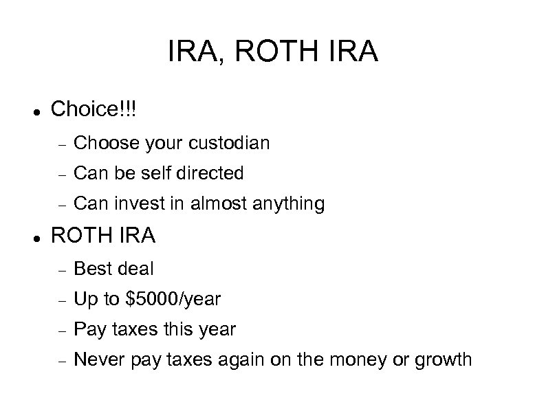 IRA, ROTH IRA Choice!!! Can be self directed Choose your custodian Can invest in almost anything ROTH IRA Best deal Up to $5000/year Pay taxes this year Never pay taxes again on the money or growth
