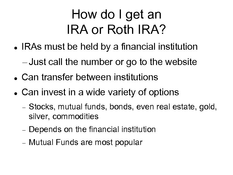 How do I get an IRA or Roth IRA? IRAs must be held by a financial institution – Just call the number or go to the website Can transfer between institutions Can invest in a wide variety of options Stocks, mutual funds, bonds, even real estate, gold, silver, commodities Depends on the financial institution Mutual Funds are most popular