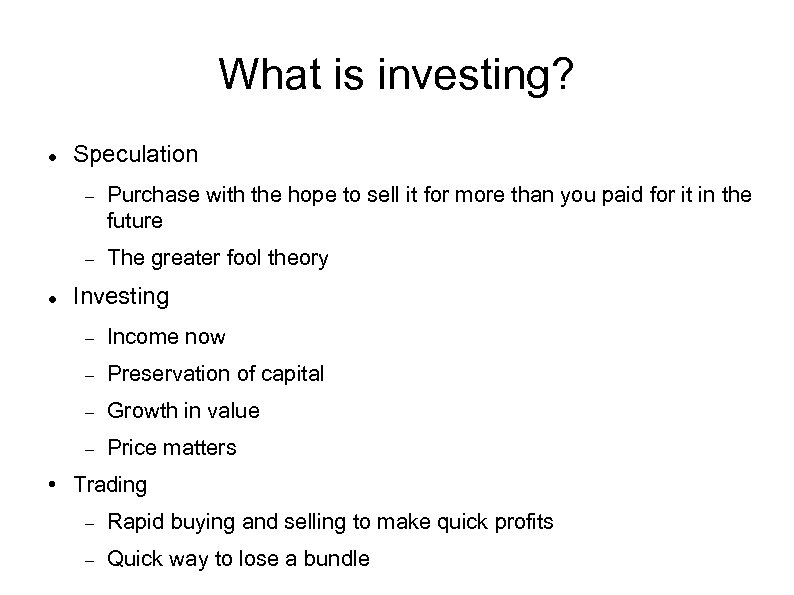 What is investing? Speculation Purchase with the hope to sell it for more than you paid for it in the future The greater fool theory Investing Income now Preservation of capital Growth in value Price matters • Trading Rapid buying and selling to make quick profits Quick way to lose a bundle