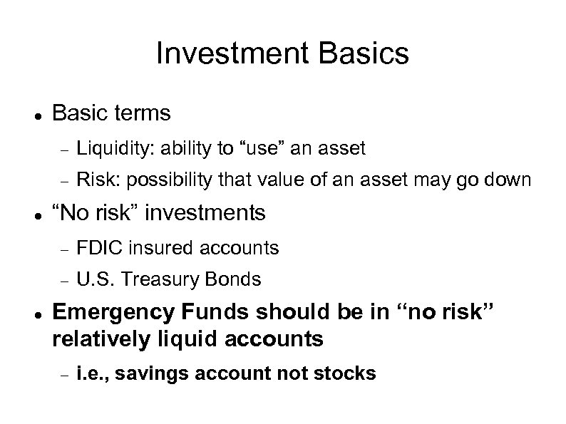 Investment Basics Basic terms Liquidity: ability to “use” an asset Risk: possibility that value of an asset may go down “No risk” investments FDIC insured accounts U. S. Treasury Bonds Emergency Funds should be in “no risk” relatively liquid accounts i. e. , savings account not stocks