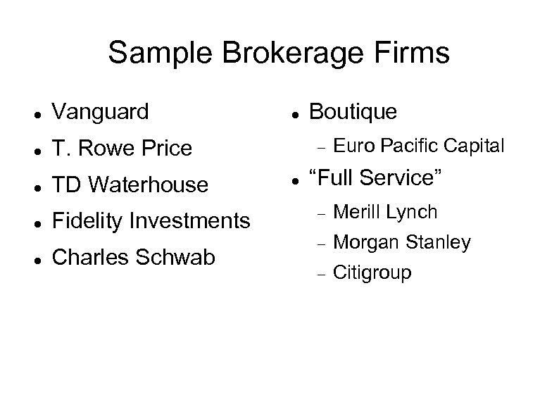 Sample Brokerage Firms Vanguard T. Rowe Price TD Waterhouse Fidelity Investments Charles Schwab Boutique Euro Pacific Capital “Full Service” Merill Lynch Morgan Stanley Citigroup