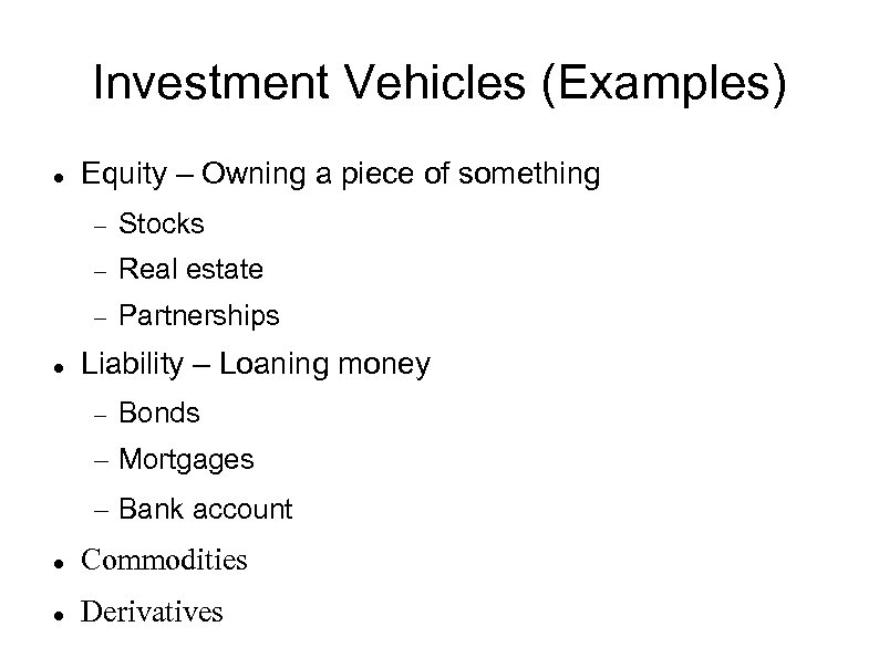 Investment Vehicles (Examples) Equity – Owning a piece of something Real estate Stocks Partnerships Liability – Loaning money Bonds – Mortgages – Bank account Commodities Derivatives